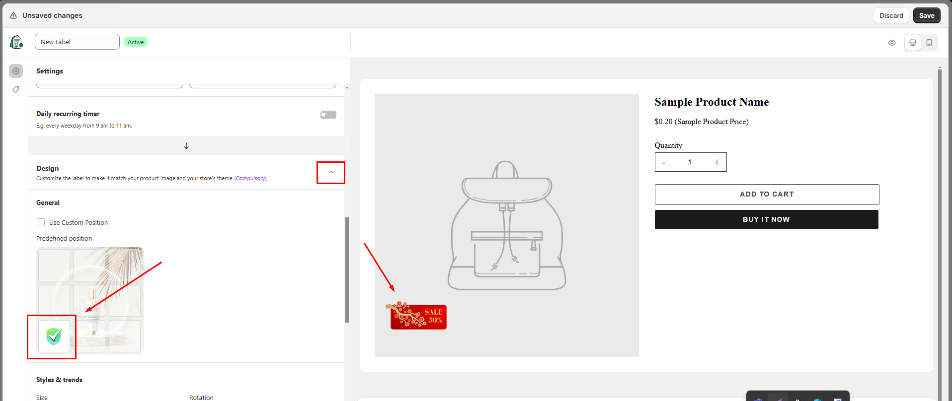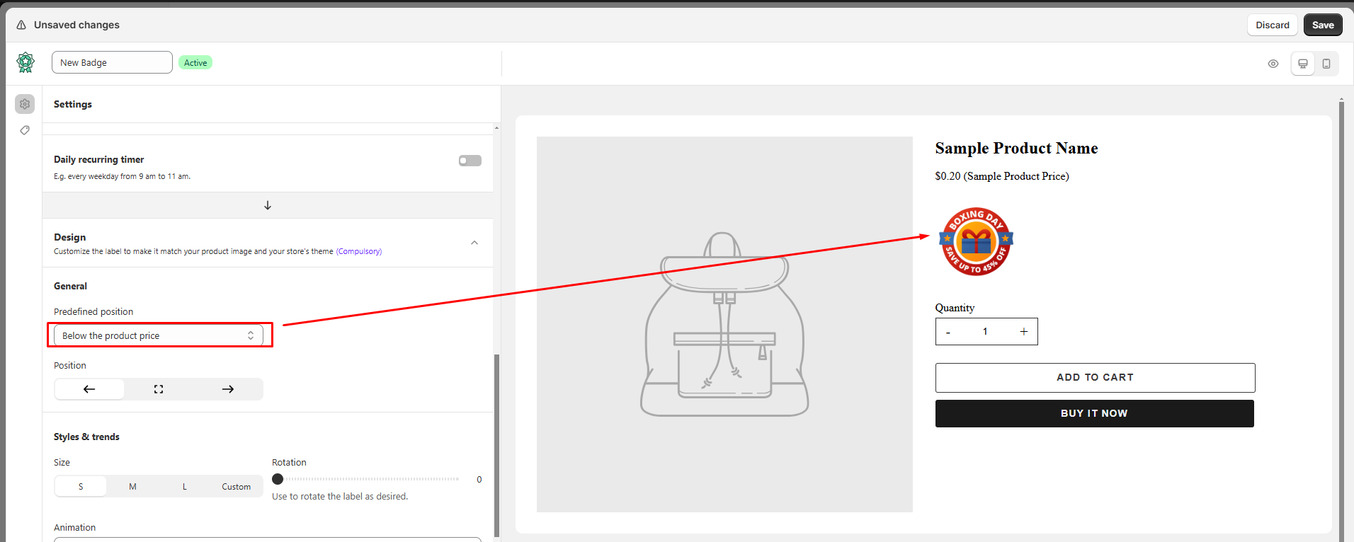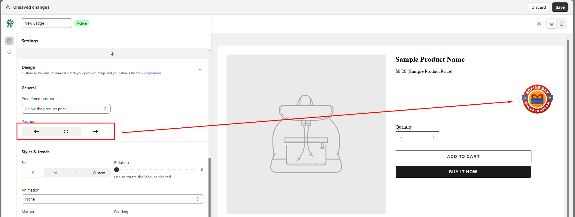 4. Change the position of the badge on the product page by selecting the option in the **Position** dropdown below:
