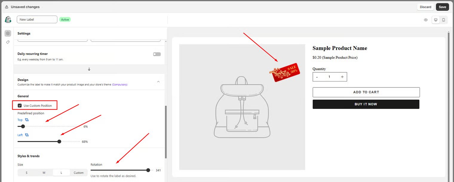 * **Custom** position: Click **Custom** and customize the position of the badge based on your need&#x73;**.** [Learn more](https://help.samita.io/docs/product-label/badge-and-labels/use-id-class-to-change-the-position-of-badge-label-on-front-store/)