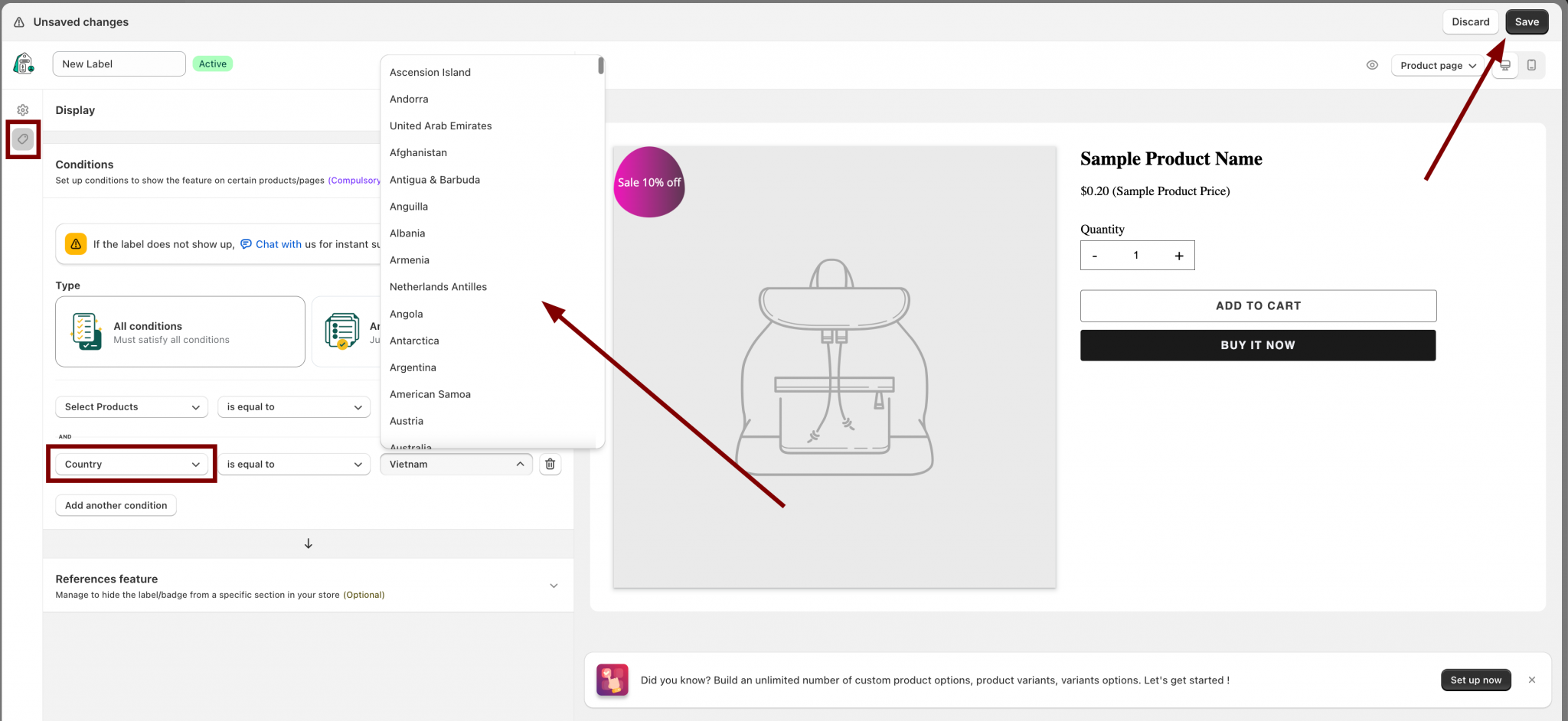 Not only show the label due to the product data in the theme, Sami Product Labels app can also show the label due to the location (country) of the customers who access your store site.
