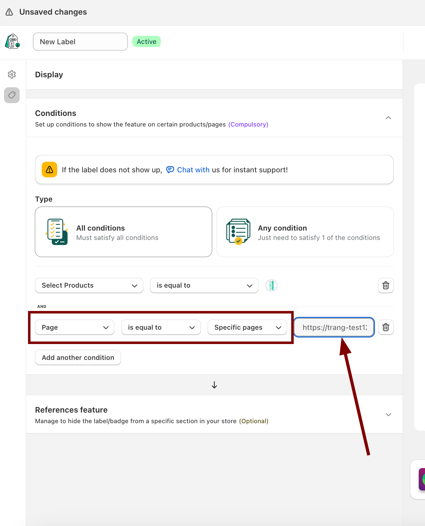 If the page you want to show the label is not listed in the dropdown setting, please use the “specific page” option and paste the page URL into the input field as belows: