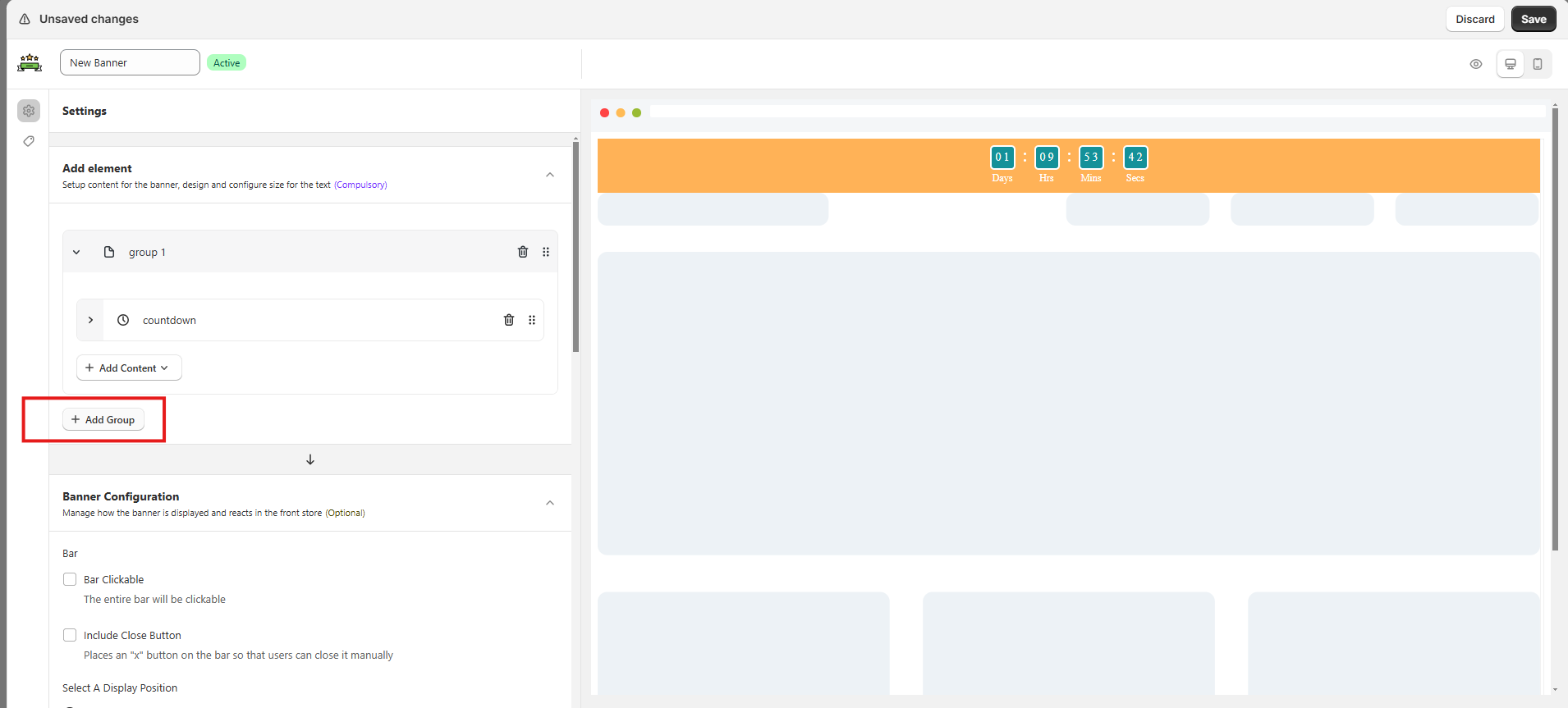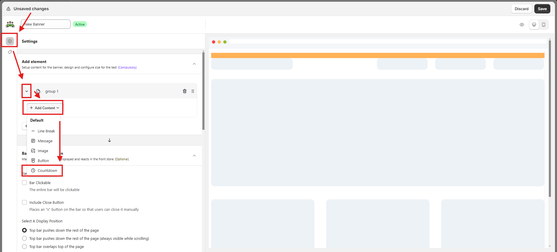 &#x20; 2\. Click the **Settings** icon on the left > in the **Elements** sections, click on **Group 1** of the banner > click **Add content** > Select one of the content types: **Line break, Message, Button, Image > Countdown.** For example, click Countdown to create Countdown for the banner