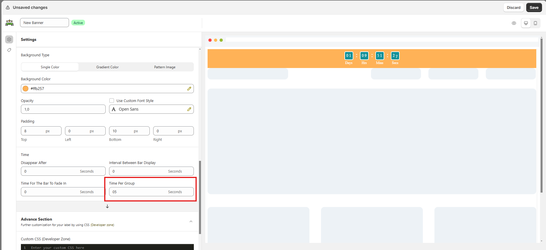 &#x20;6\. Scroll to **Time** part > set **Time Per Group**. For example: *The Time Per Group is 5* *seconds*, which means that each group will show up in 5 seconds on the banner