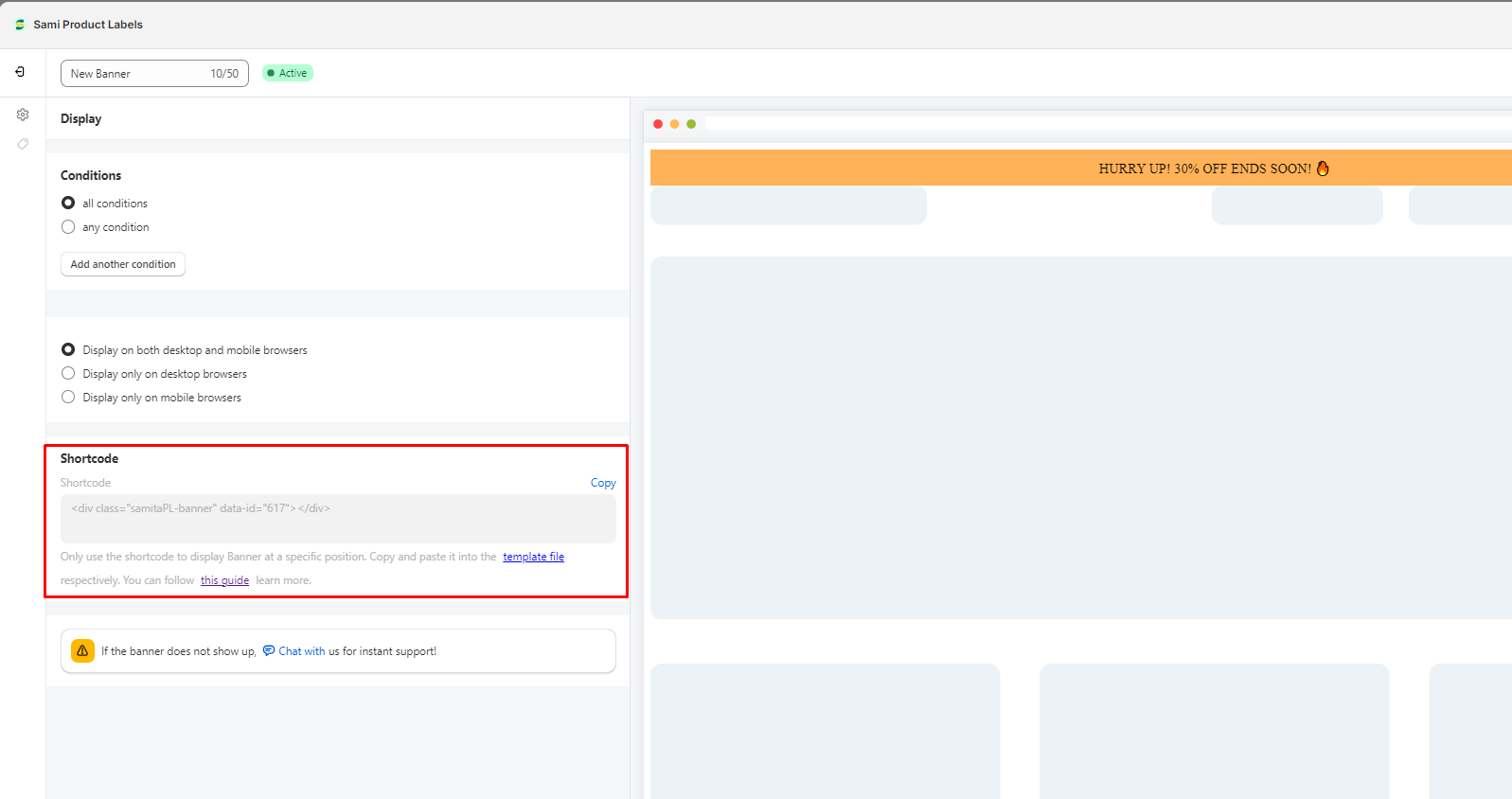 3. Click the **Display** icon on the left sidebar > Copy the Shortcode of the banner