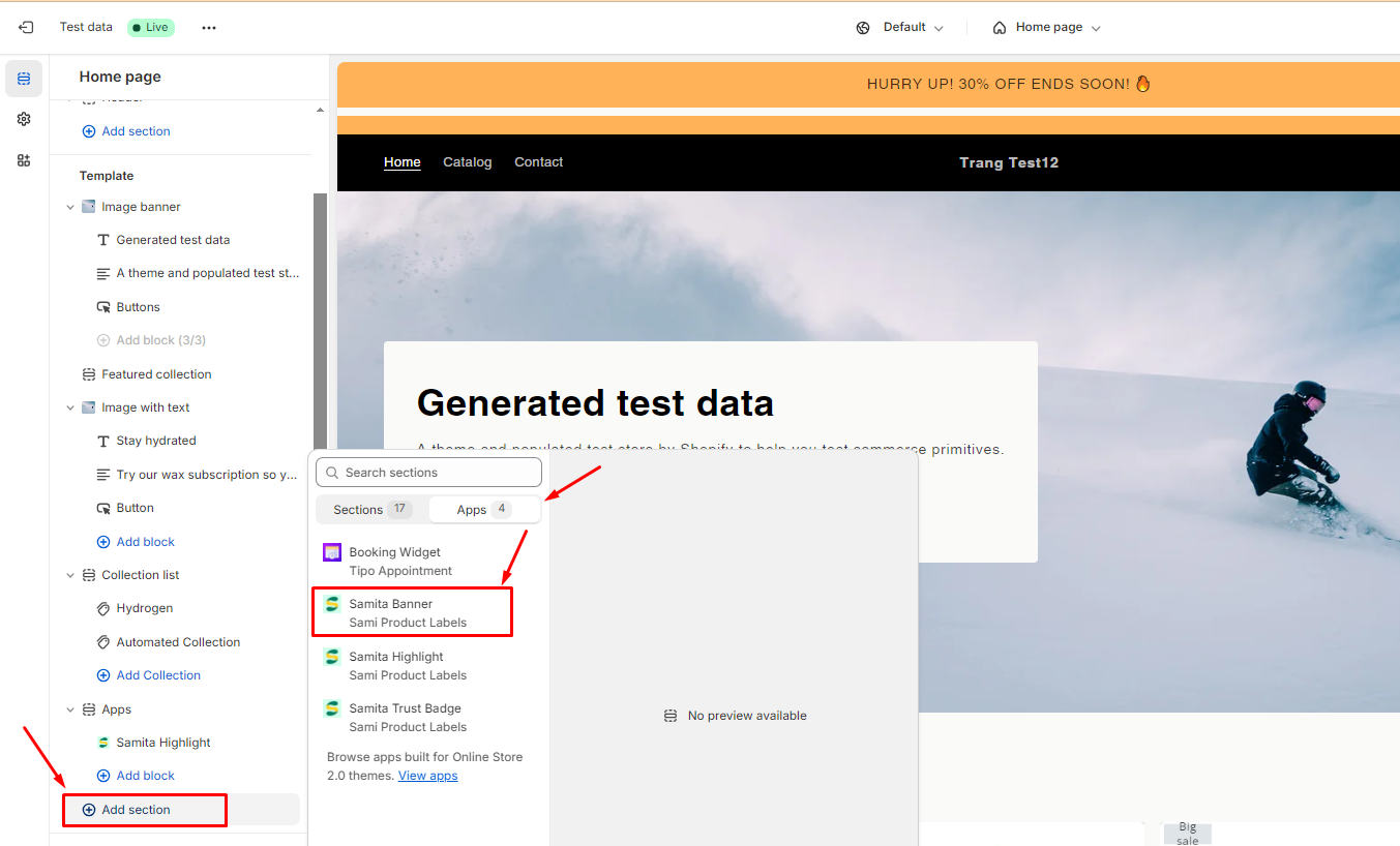3. On the left, click **Add section** > **Apps** > select **Samita banner**&#x20;