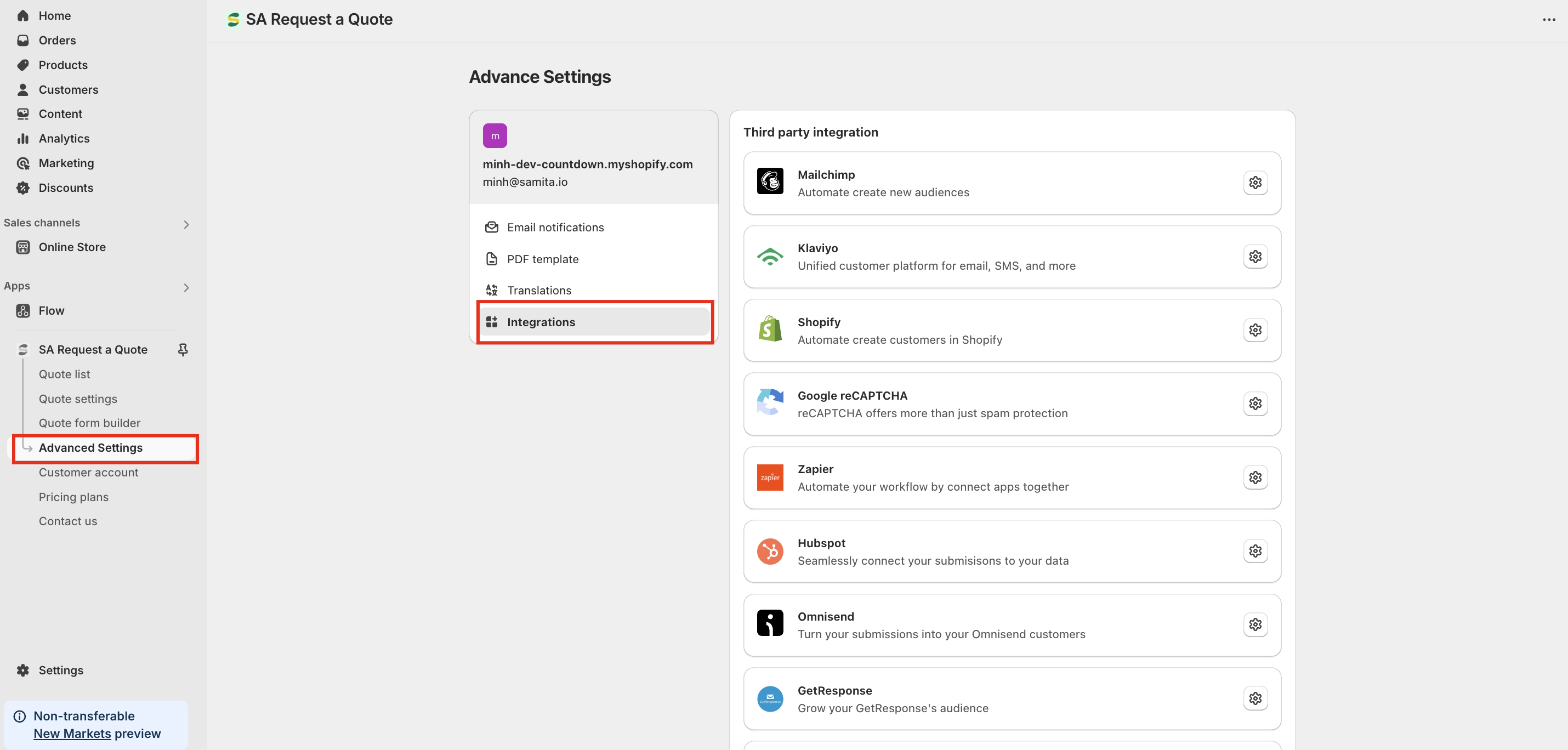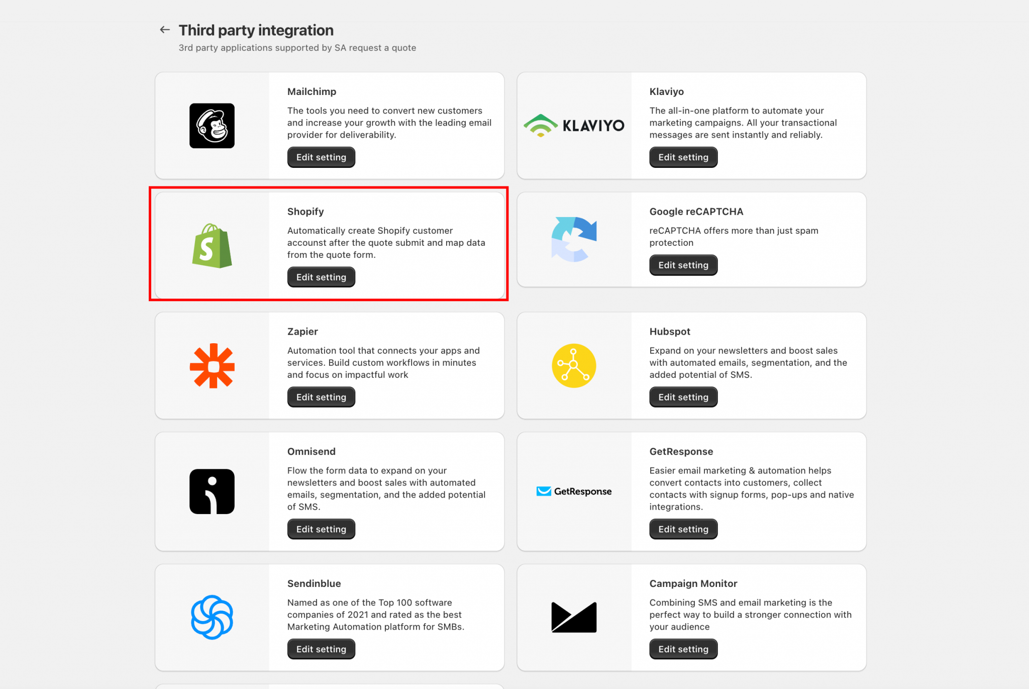 &#x20;1\. From the app admin page, click Quote settings > Select the Integration section > **Shopify**