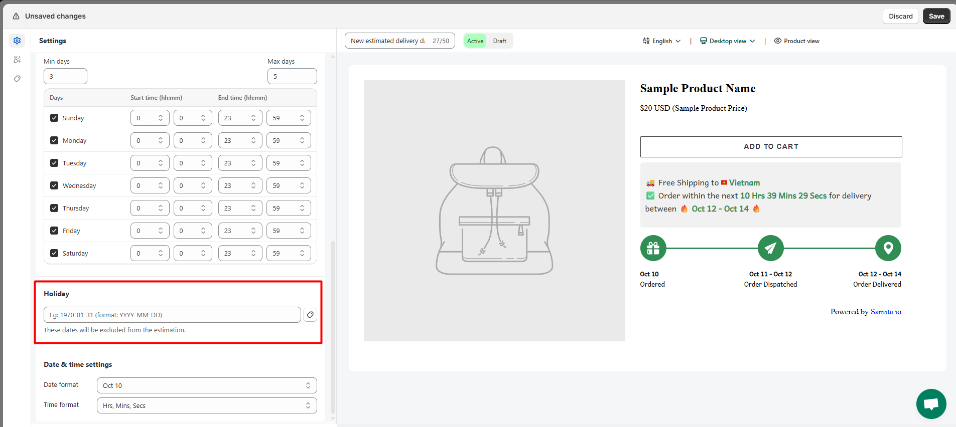 After setting up the content for the Estimated delivery date, you will need to configure the time range for the delivery.&#x20;